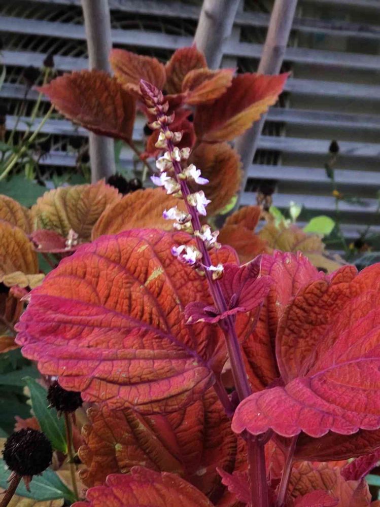 黒味を帯びた深い紅色のコリウスが花を付けています。