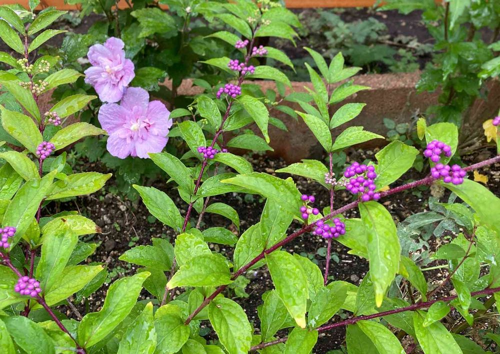 小さな庭,ムラサキシキブ,ムクゲ 大徳寺丁字咲きの投稿画像
