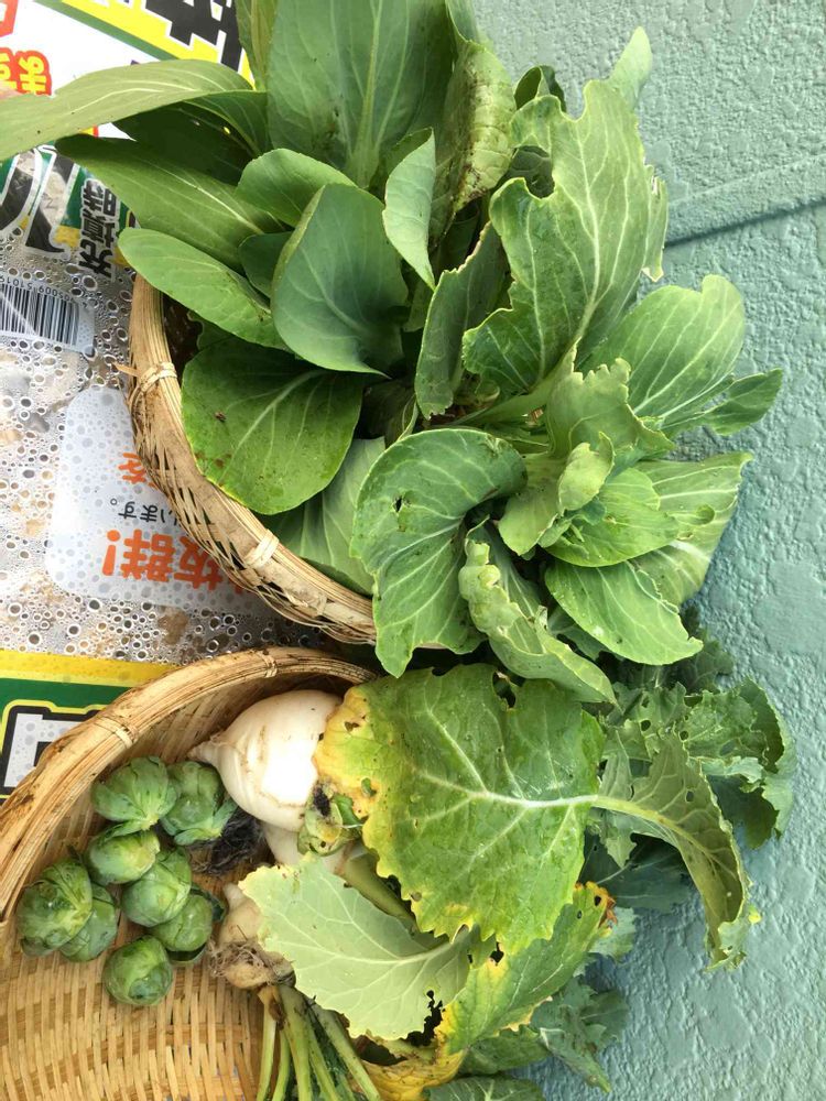 久しぶりの収穫はコカブ3個、青梗菜5本、芽キャベツ8個(10円玉くらい試食用)