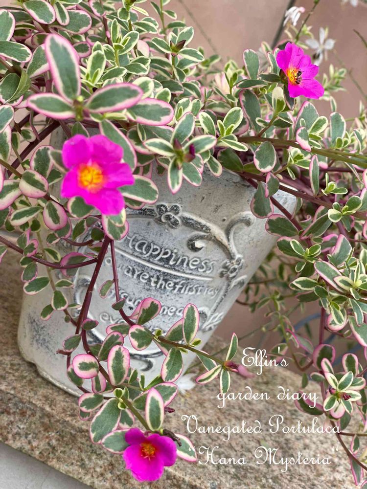 今日のpicは、斑入りポーチュラカ“華ミステリア“。午後になると花がつぼんでしまうので、なかなか綺麗に咲いているところが撮れず…。やっと今日撮れました😄