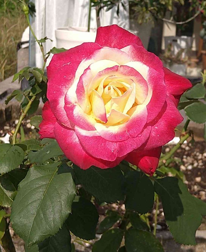 真ん中が黄色みがかったクリーム色で、まわりが赤いバラです。