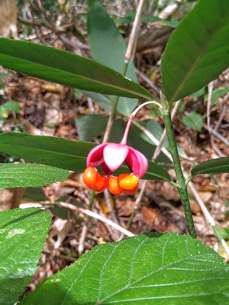 さん、四つ割りマユミ、と五つ割りツリバナですね!これから色々なニシキギ科植物が実を割ります。気をつけて観察してみます。細い厚葉と低い樹高が特徴のムラサキマユミだと思います。良く見ると四つ割りですね。ありがとうございました。