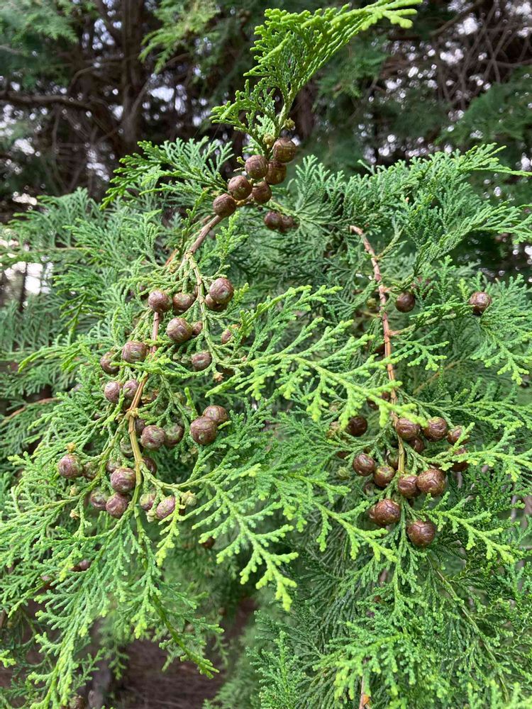 だいぶ茶色くなったヒノキ?の実がたわわに。これも花粉症の方には、辛い植物かなぁ。