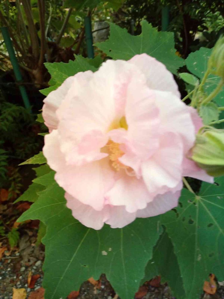 ご近所さんの🦮が、散歩中に急に👼に行き、庭に造られたお墓にお参りに行き、淡いピンクの酔芙蓉を見つけました。