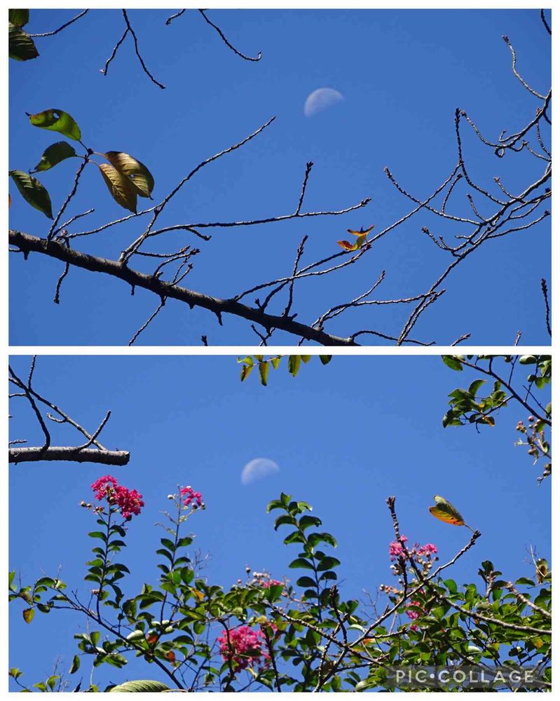 青空とサルスベリを撮ろうとしたら 月が出ていたので、お花より月を優先させました。