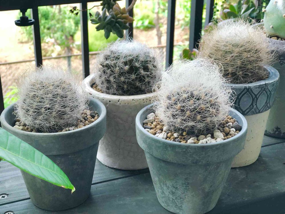 おじコレ🌵全部白翁玉だけどそれぞれ棘の縮れ具合や長さや色がちょっとずつ違って可愛い🤤 でもいつか縦に伸びるのがちょっと寂しい。