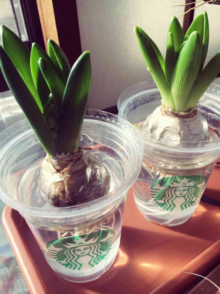 スタバのカップが捨てられなくて1月14日からヒヤシンスの水栽培始めました(⁎⁍̴̆Ɛ⁍̴̆⁎)