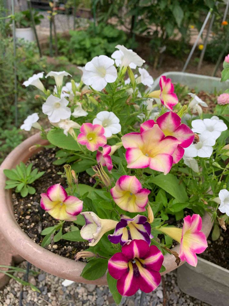 サフイニアさん凄い❗零れ種から小さな時は、私だったら草と思って 抜いてしまいます🤥よくナメクジに食べられなかったですね😵