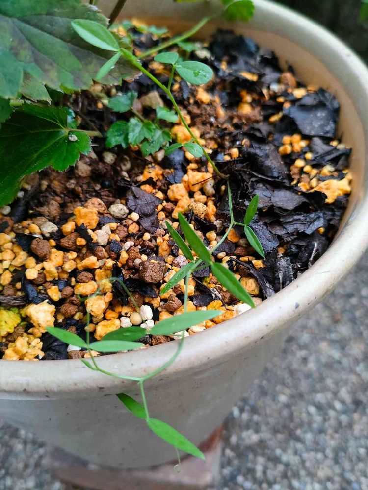 秋明菊の苗を園芸店で購入し、植木鉢にうえていたら、見たことがない、芽が出てきましたー