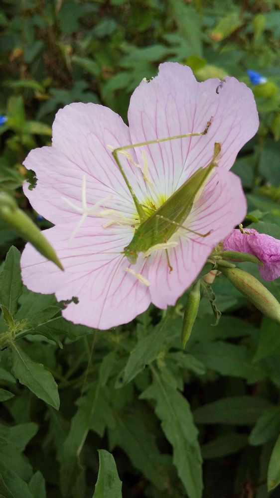 今日の「月見草」には、「ウマオイ」バッタさんがいました。スイッチョン、良い鳴き声で鳴きます。🌺🦗🌿🤗😀🌆