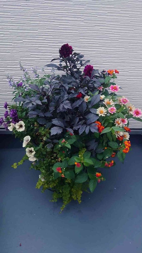 銅葉のダリアもペチュニア達もダークな雰囲気のものをチョイスしたので、「魔界」と呼んでいた寄せ植え