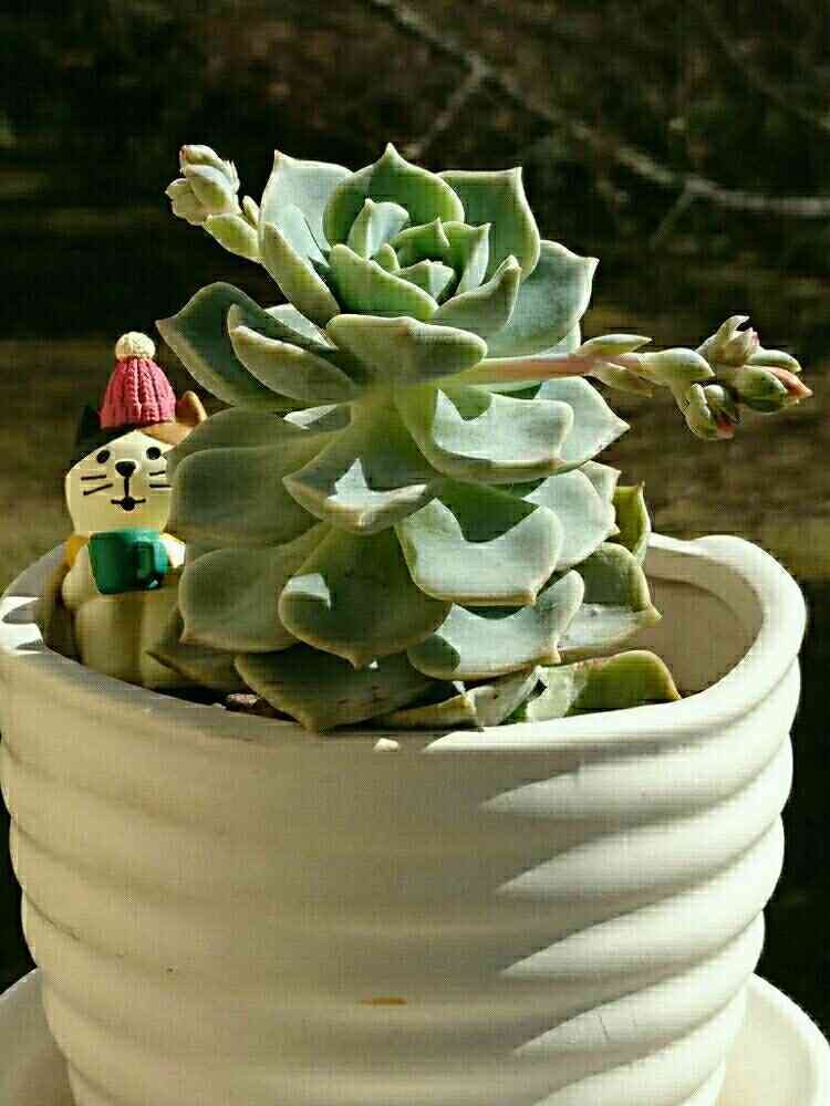 多肉ちゃんもツボミも鉢もちょこっとお座りしてるネコちゃんも