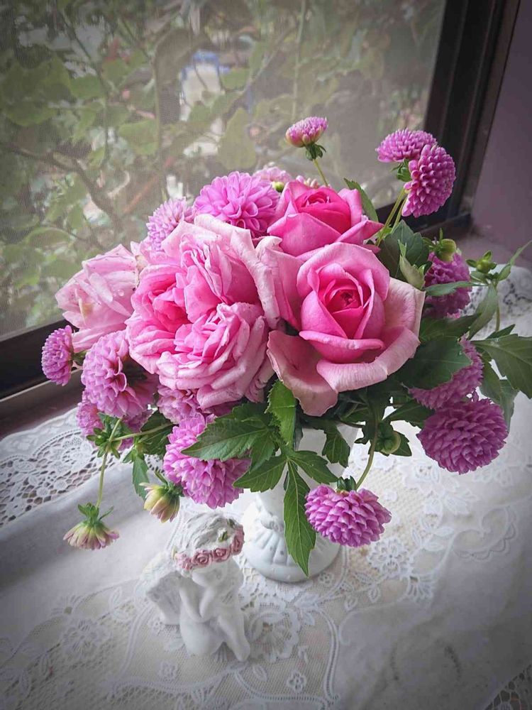 名前わからないけれど😂凄く香りのいいローズポンパドールにちょっと似た子🌹 うなだれていたのでカットしてポンポンダリアと窓辺に🎵