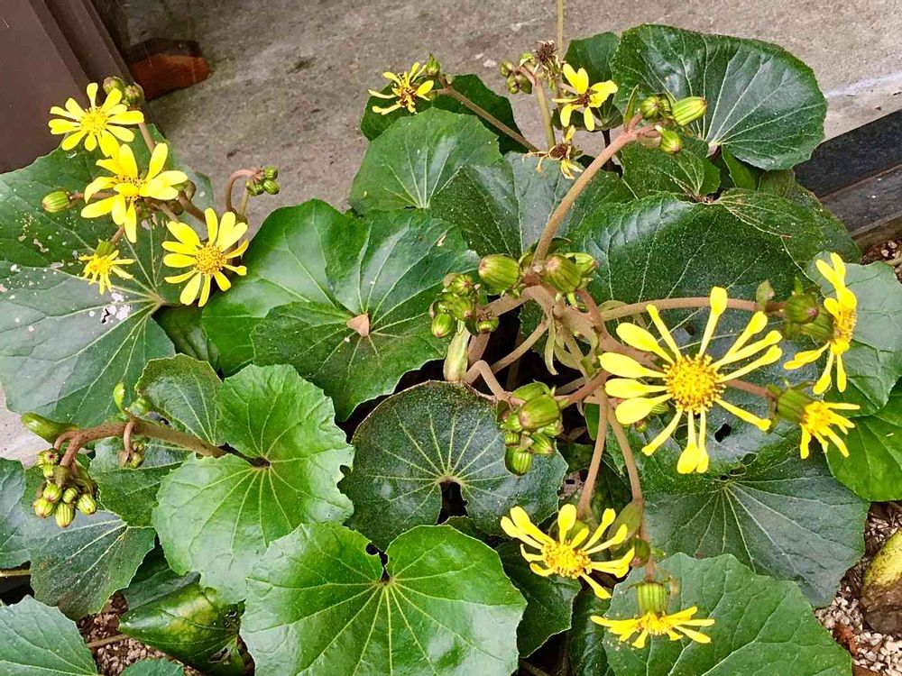 ツワブキは海沿いの草原や崖、林の縁に見られる常緑の多年草です。葉は革質でつやがあり、円くて直径20cm前後あります。新芽は茶色の綿毛に包まれていますが、成長につれて取れていきます。地下には短いワサビ状の根茎が連なり、大きな株になります。花は株の中心から出て、先端に10~30輪ほどのキクに似た、花径3cm前後の黄色い花を咲かせます。