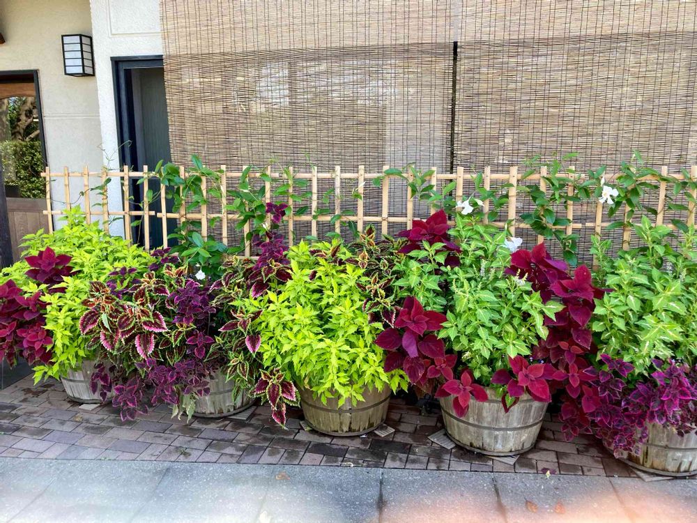 葉色が素敵なコリウスの寄植え🌿と竹で作られた和風のトレリスにサンパラソルのツルが絡めてありいい感じで素敵な空間で