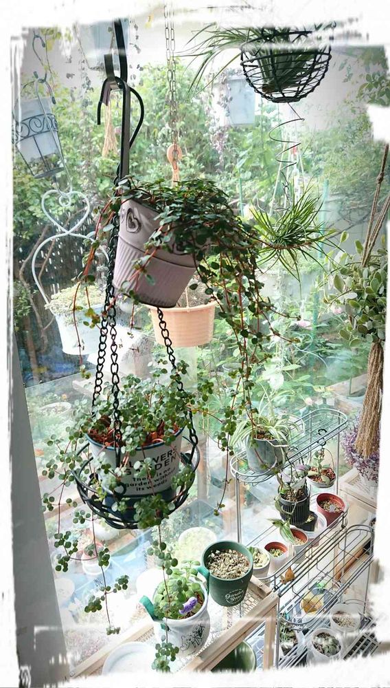 窓辺は中も外も植物ぶら下げて日に当ていますよ~~❗