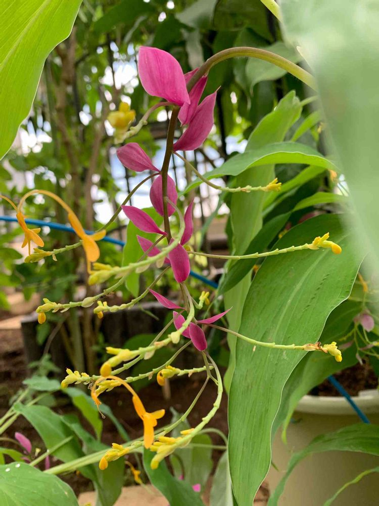 別名『シャムの舞姫』優雅に踊っていましたよ🎶ピンクは苞で先に付いてるの黄色部分が花です。雄しべが弓なりに上に伸び、先端に星⭐️がついているような姿が、優美でした。