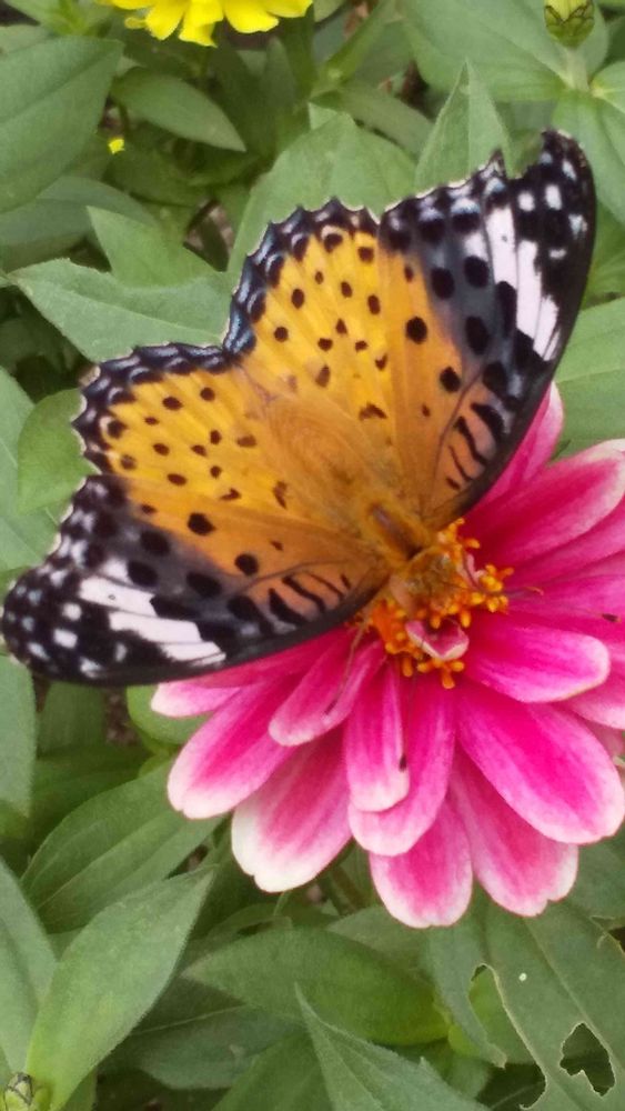 ピンク色の「ジニア」の花びらで、ツマグロヒョウモン(♀)が羽を広げてくれました。🌺🦋🤗😃
