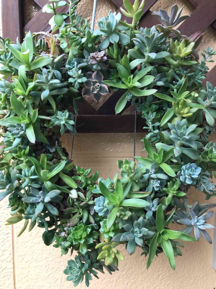 6月に、カラーを散らして作成した多肉リースですが、緑一色になっちゃいました。