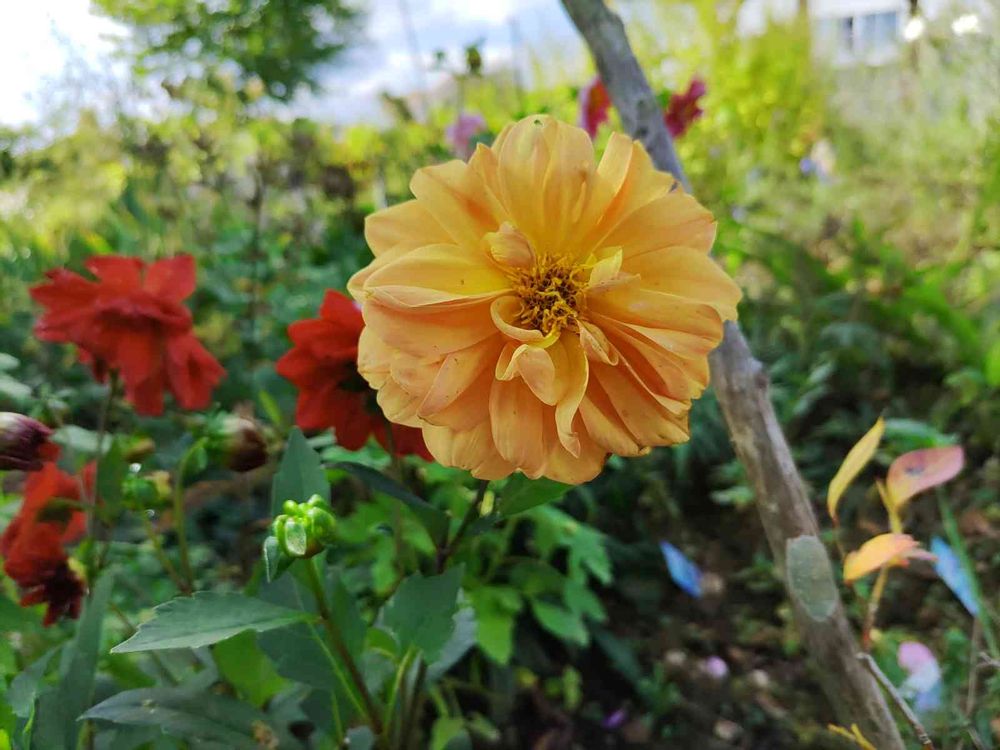 一本の赤いダリア株なのにオレンジ色が1つ咲いてるの😆