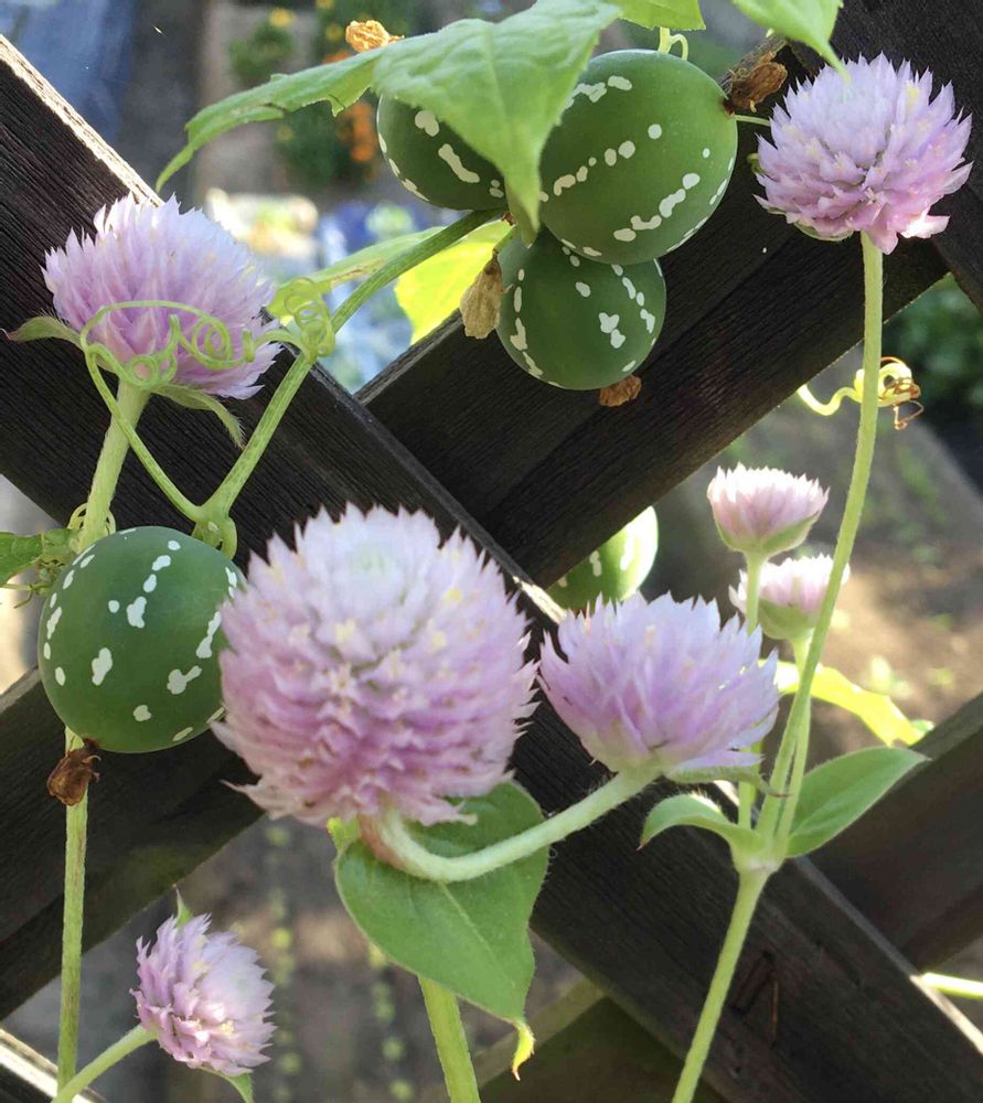 スズメウリとピンクの千日紅のコラボ、可愛いですね〜😊