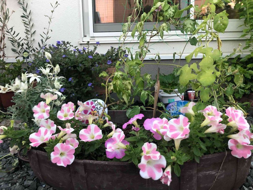 朝顔プランターのあきスペースに植えましたが、元気に育っています✨
