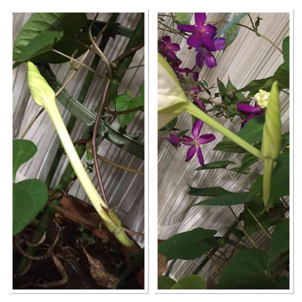 左の夕顔の花弁がだいぶ伸びてきた。朝、雨戸を開けるのを遅らせたら朝に花を開かせるか。