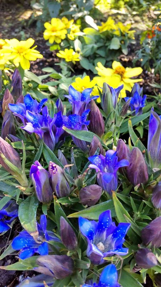 背の低いリンドウとジニア。秋を感じますね!🌰