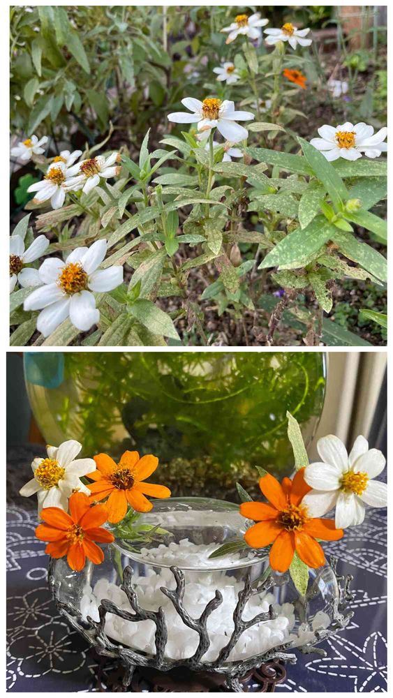 下の素敵な花瓶に可愛く生けられたジニアさん、おしゃれです〜