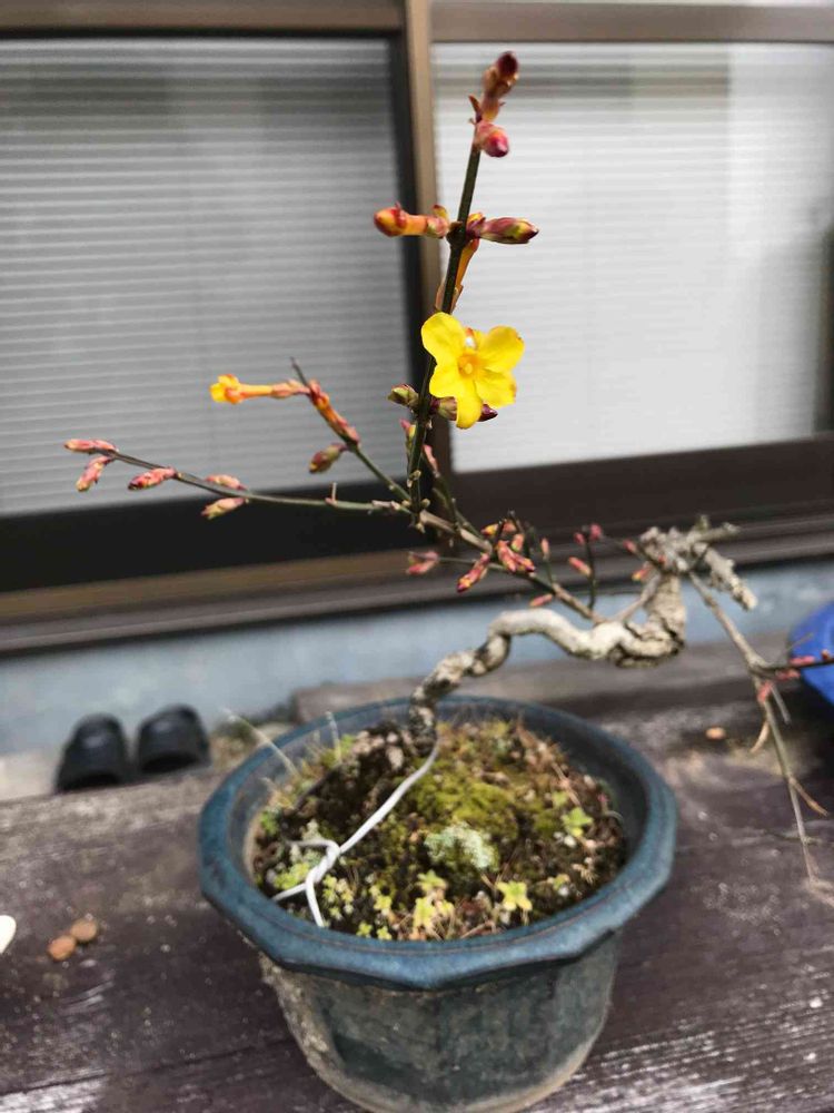 祖父が亡くなり5年以上放ったらかしになってた黄梅が一番乗り。盆栽たくさんあるけど何したらいいのか、放置してしまってる。それでも咲く、強し。