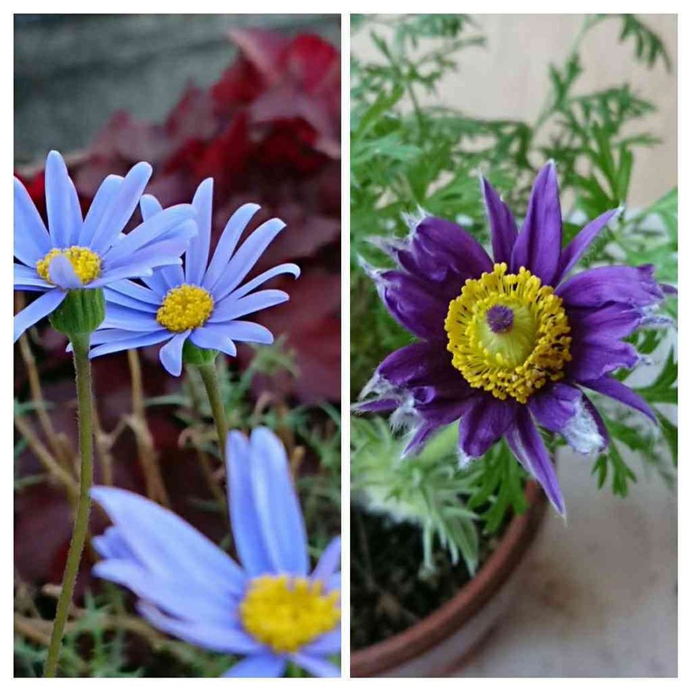 ブルーデージーのブルー🫐もオキナソウの紫もとても素敵な色ですね。