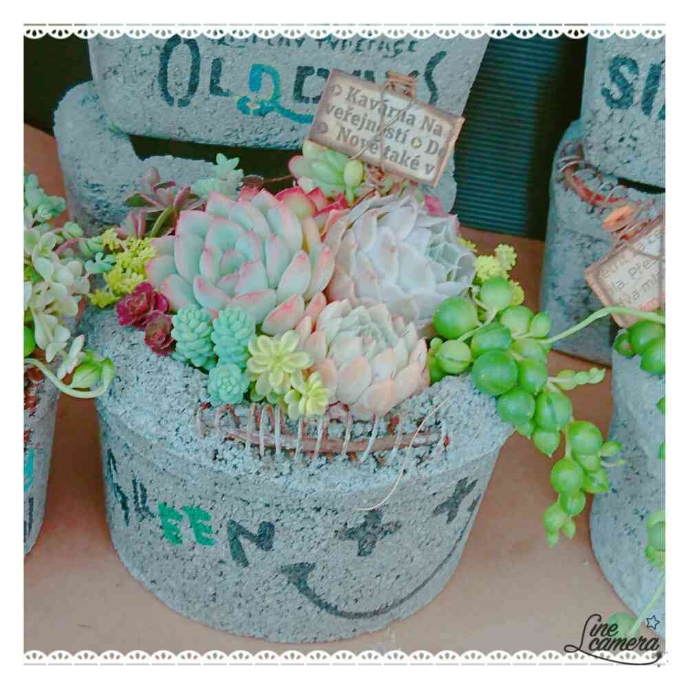 WSもみんなでワイワイ🙌ikuraちゃんの寄せ植え講師さばきでみごとに可愛いコンクリ鉢の韓国苗寄せ出来たよー❤