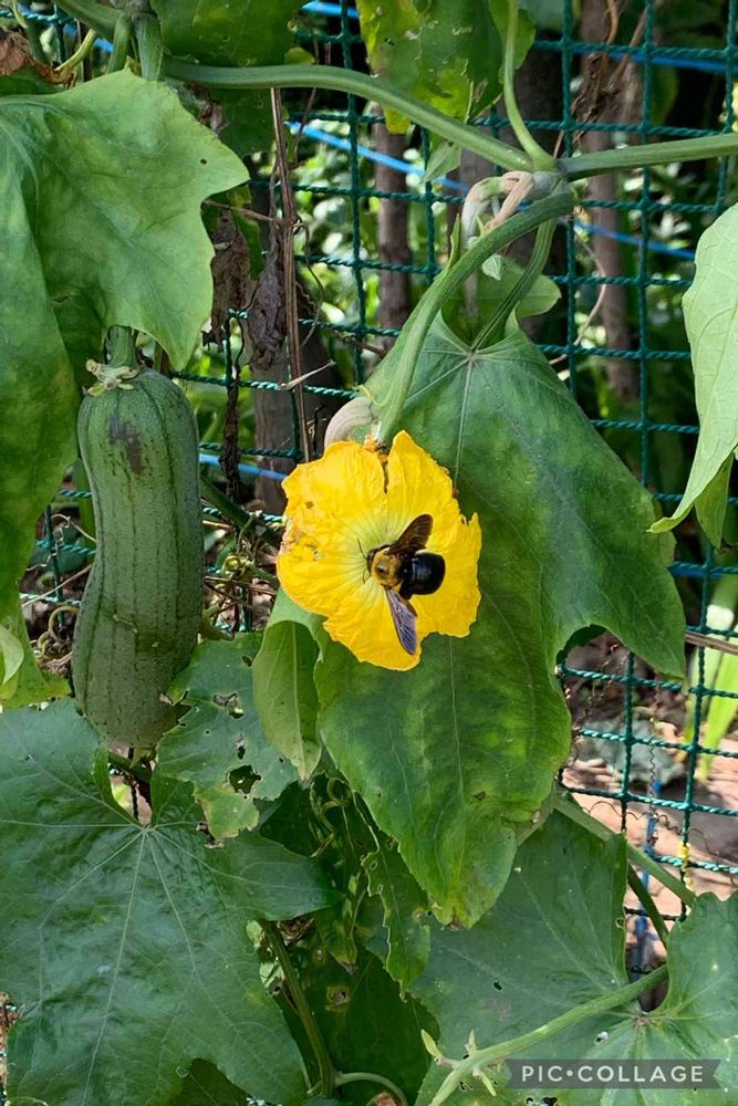 大きなへちまを発見👀 この蜂さんはなんていう名前か分からないけど一緒にパシャリ📸