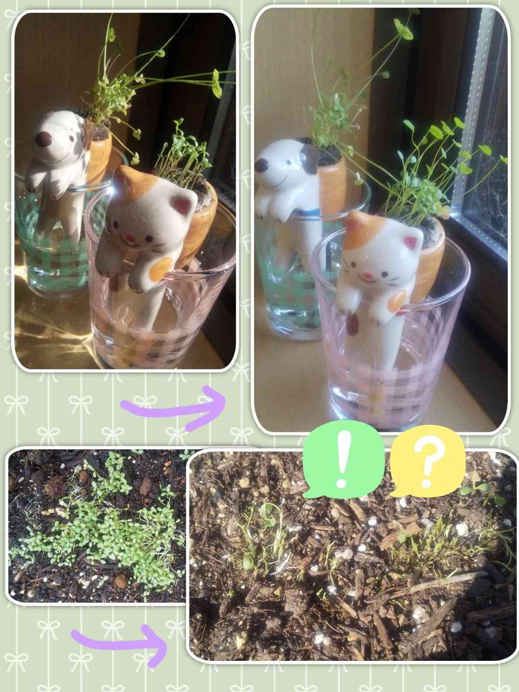 約2週間前に蒔いた「ホワイトクローバー🍀」の種の芽がすぐに出て、左⬅️がそれぞれ1週間前で右➡️が今日なのですが、外の花壇に蒔いた芽が食べられてる⁉️