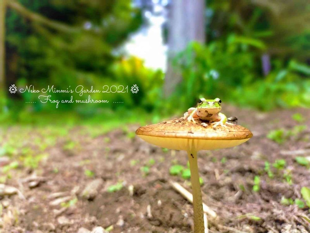 わぁー😆🍄の上に上手にちょこんとカエルさんが乗ってますね😃カメラ目線で見ててかわいらしいですね❤️見つかってびっくりしたのかな😊