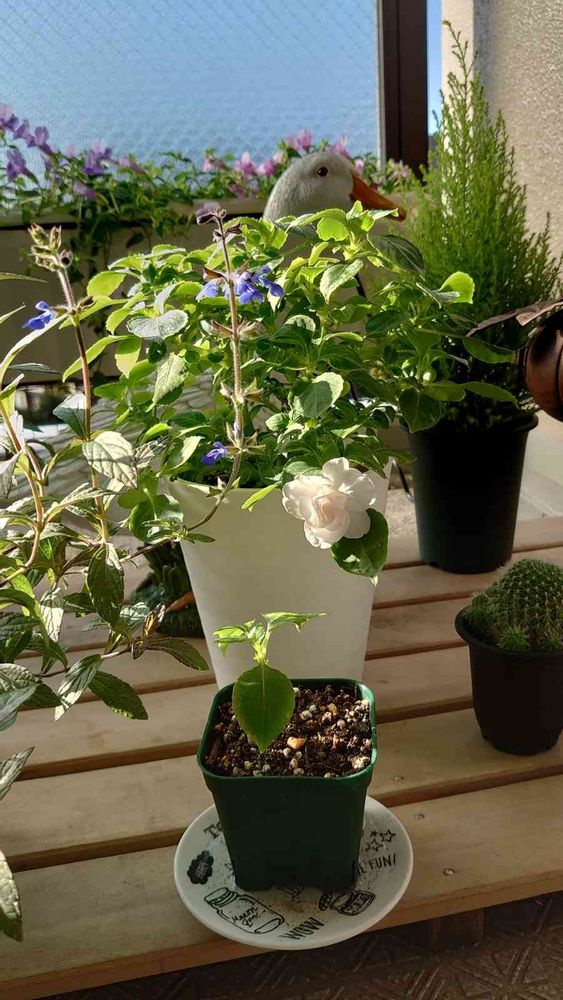 お迎えのときに折れた枝があり、試しに水差ししてみたところ、ぐんぐん根っこがのびたので鉢あげしました。親子で朝のお日様を浴びています☀️左隣は垂れまくりのサルビアコスミックブルーさんです。