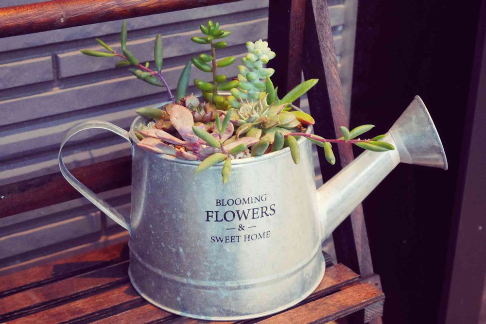 よくありがちですが、ブリキジョウロに多肉を寄せ植えしたものです。