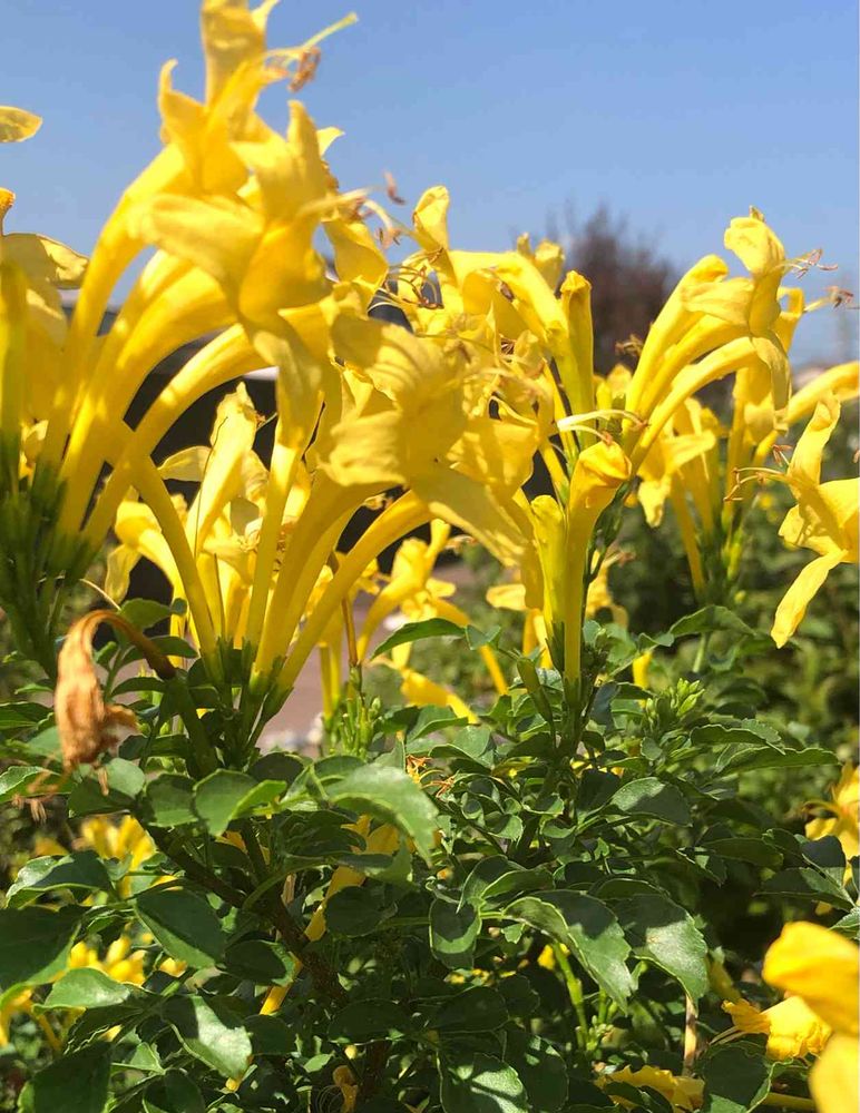 おはようございます。散歩道の花畑。キイロヒメノウゼンカズラが青空に伸びていました。
