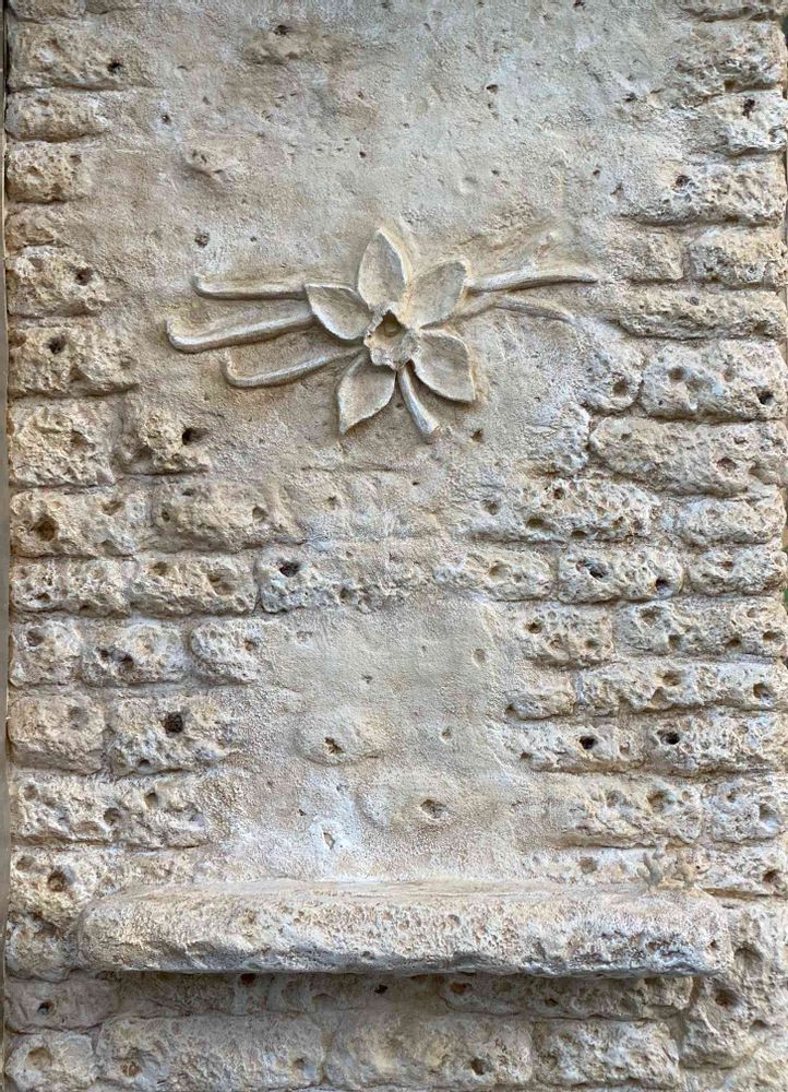 バニラの事務所看板壁にバニラのモルタル造形レリーフ。周りの石は琉球石灰岩風モルタル造形。。。昨日までのお仕事。。。