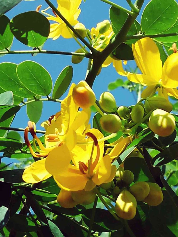 丸い蕾もたわわで 葉っぱは夜には向かい合わせのがピッタリくっついて 眠るんですよ😴🌿 可愛いです😊 青空に黄色は 爽やかですね🎶