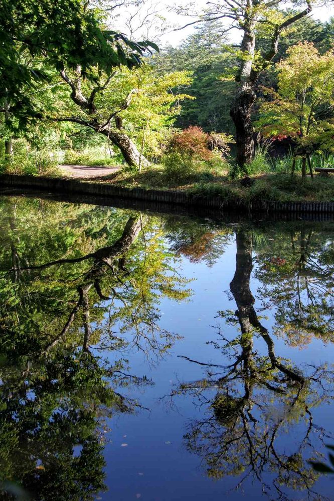 眩しいほどの朝日に輝らされた木々が、その美しい姿を水面に映しだしていました