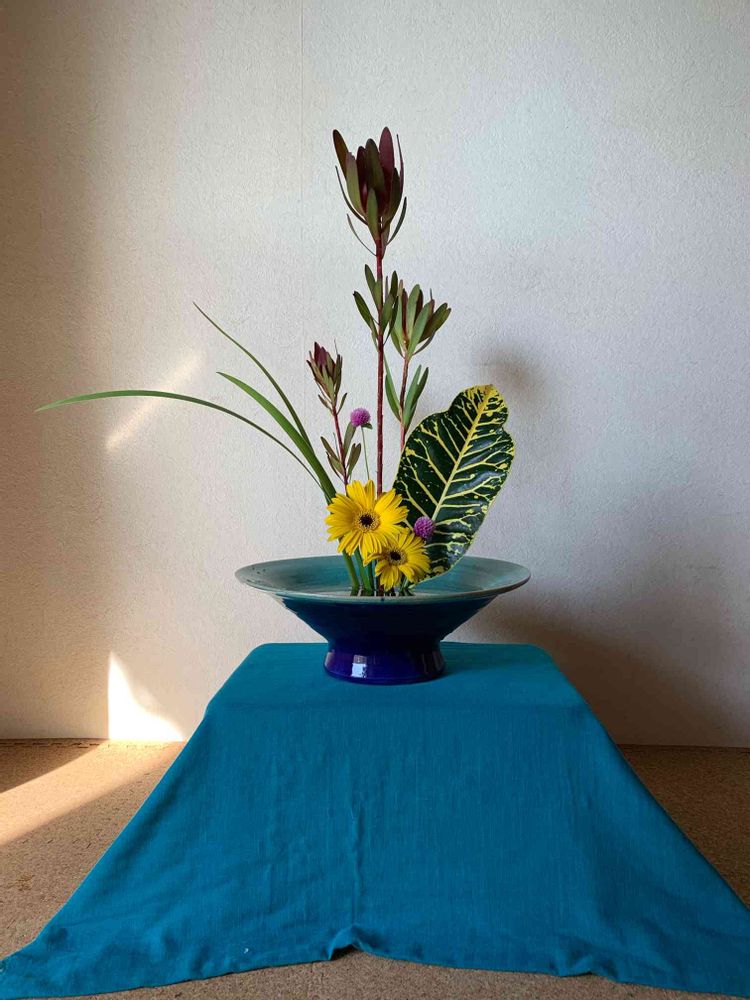 ガーベラとクロトンの黄色がさわやかに青に溶け込んでいます。元気の出る生け花ですね。