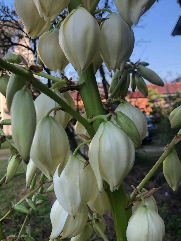 茎先に円錐花序(下のほうになるほど枝分かれする回数が多く、全体をみると円錐形になる)を出し、花径5~6センチの淡いクリーム色をした鐘形の花をたくさんつける🤗🌼