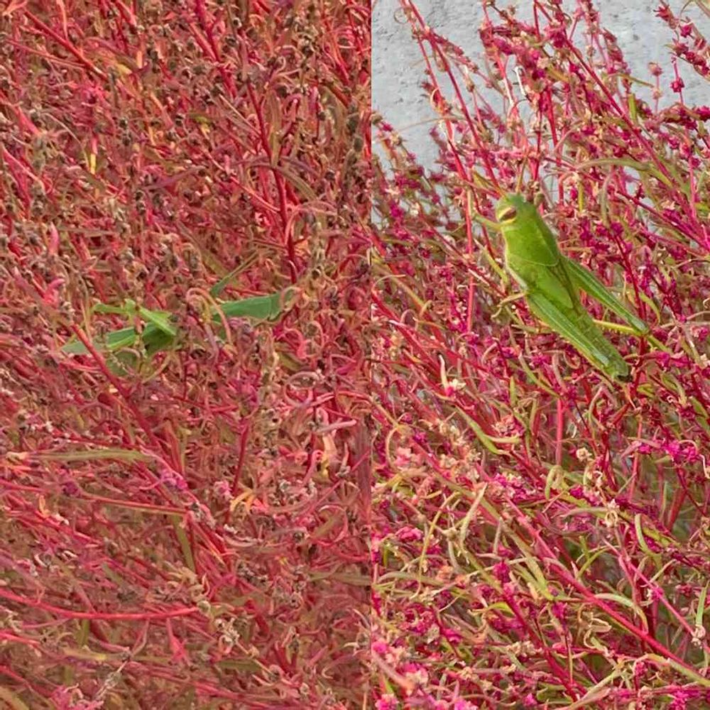 おはようございます。紅葉したコキアにバッタさん、ご夫婦もいました。お食事中ですかね〜。保護色になってません。😍🤗🥰🤗😸