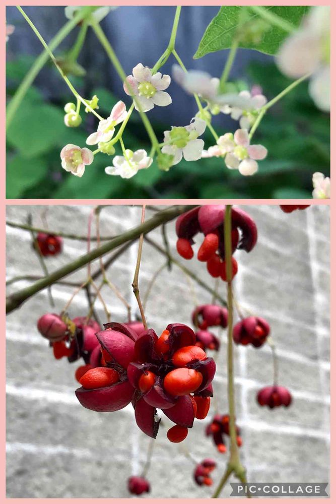 花や実が吊り下がるから『吊り花(ツリバナ)』4/26投稿(上)フワフワと風にあおられていた1㎝もない小さな花は、秋に、庭で目立つ鮮やかな紅い実に。実はパクリと5つに割れ、朱赤色の種を覗かせて、、その後❣️種も吊り下がります😀❣️紅葉も美しく、秋も見ていて楽しいです🎵💗