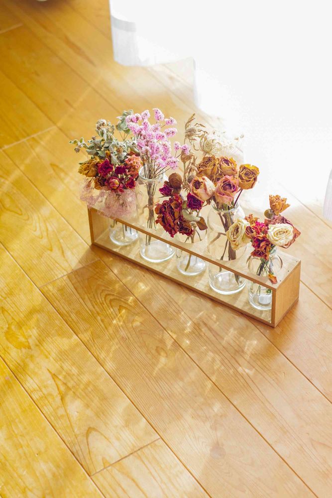 今のところ飾れる生花がないので、自家製のドライフラワーを入れてみました。