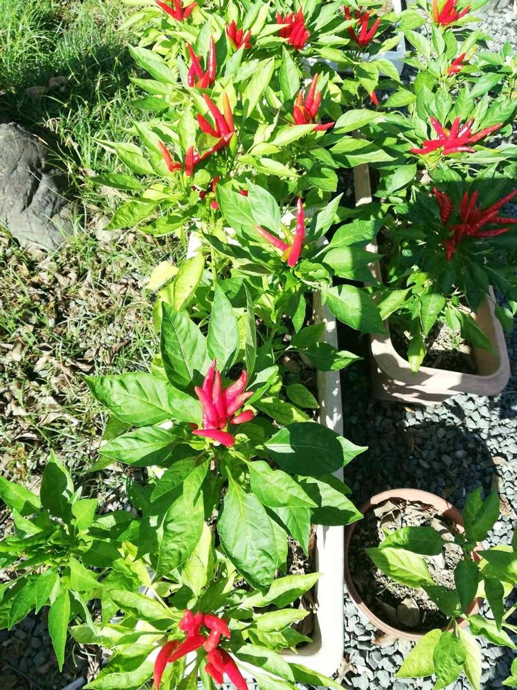唐辛子の実が、やっと色付いて来ました、真っ赤なお花が咲いているみたい。
