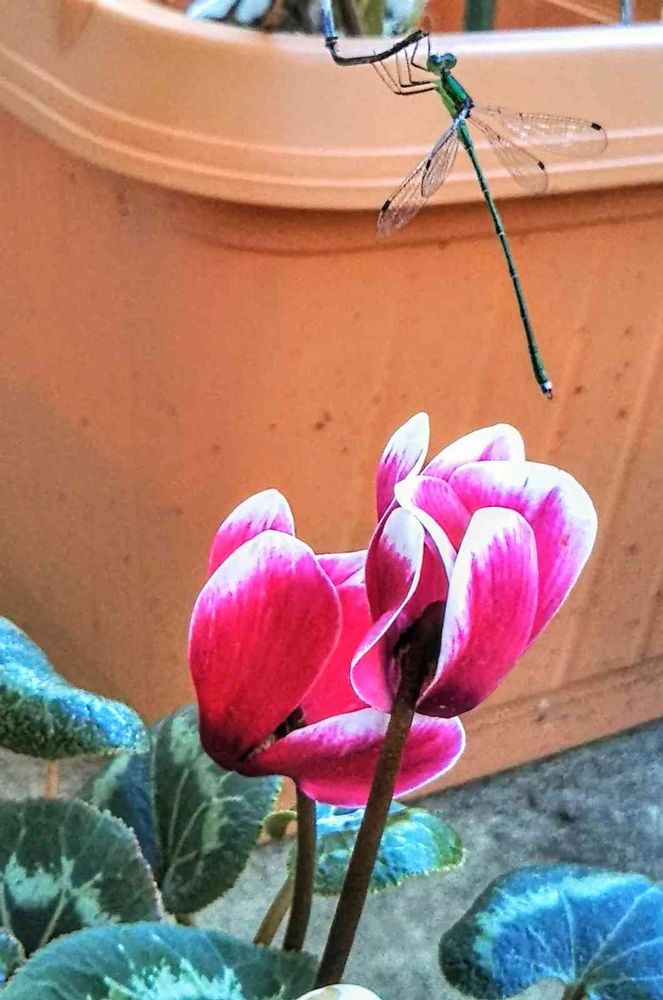 夕方のとてもきれいな色のイトトンボと咲き始めたシクラメンのpicです🍁