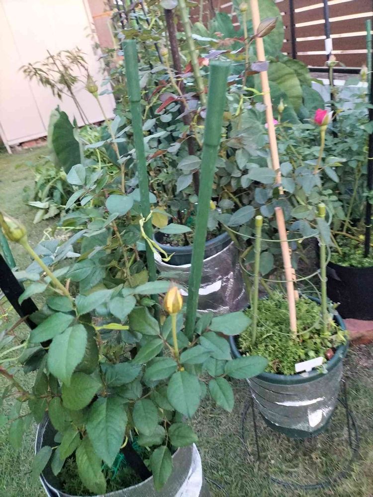 バラが、そろそろ咲きはじめています。新苗は咲かせないほうがいいという人もいますが、もう待てません。大苗より元気そう。