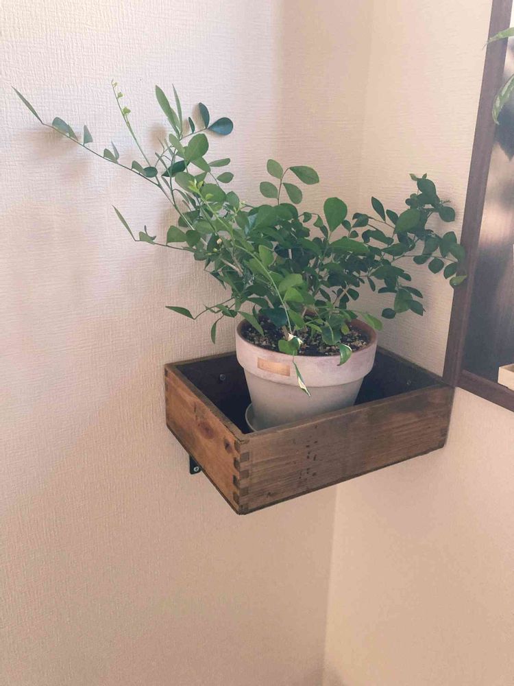 ホームセンターで買った400円くらいの木の箱に、ダイソーのウォールシェルフをサポートする金具みたいなのを2個取り付けて壁にビスで固定したものです🌿